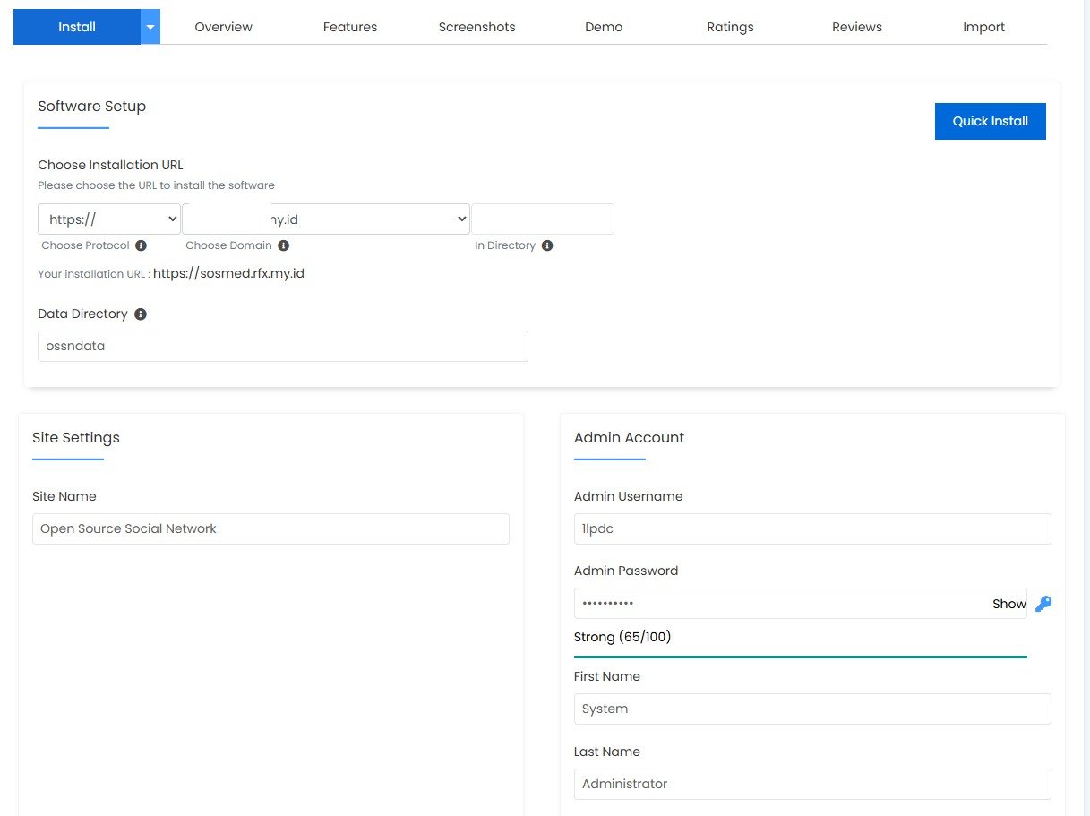 Setelah proses instal selesai, Softaculous akan menampilkan link menuju website. Silakan klik link tersebut untuk login ke halaman admin OSSN. Lalu login dengan username dan password yang telah dibuat sebelumnya.