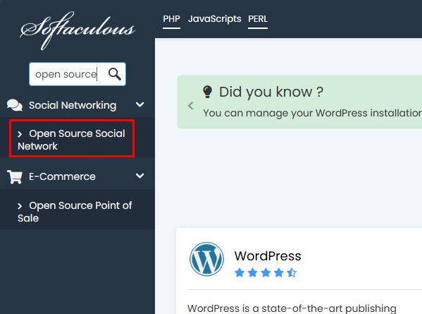 Setelah login ke cPanel, pada kolom pencarian ketik Softaculous App Installer. Lalu pada bagian kiri tampilan ketik Open Source Social Network. Klik Install.