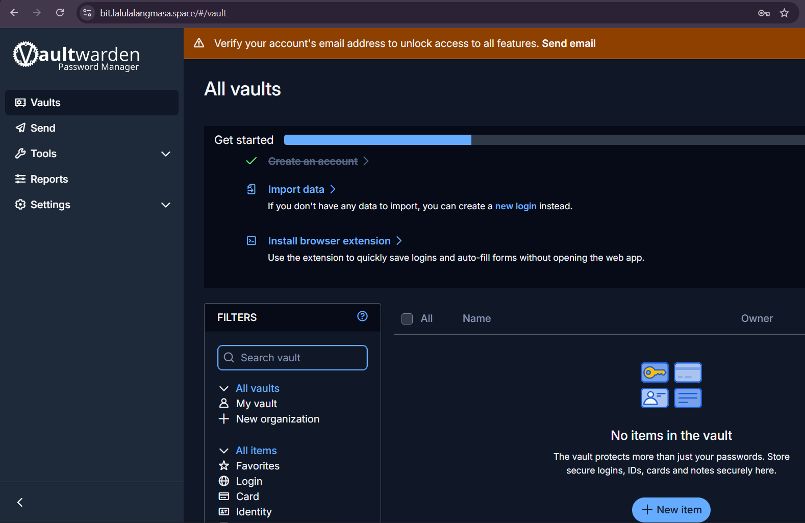 - Setelah berhasil login, maka Vaultwarden Anda sudah siap digunakan.