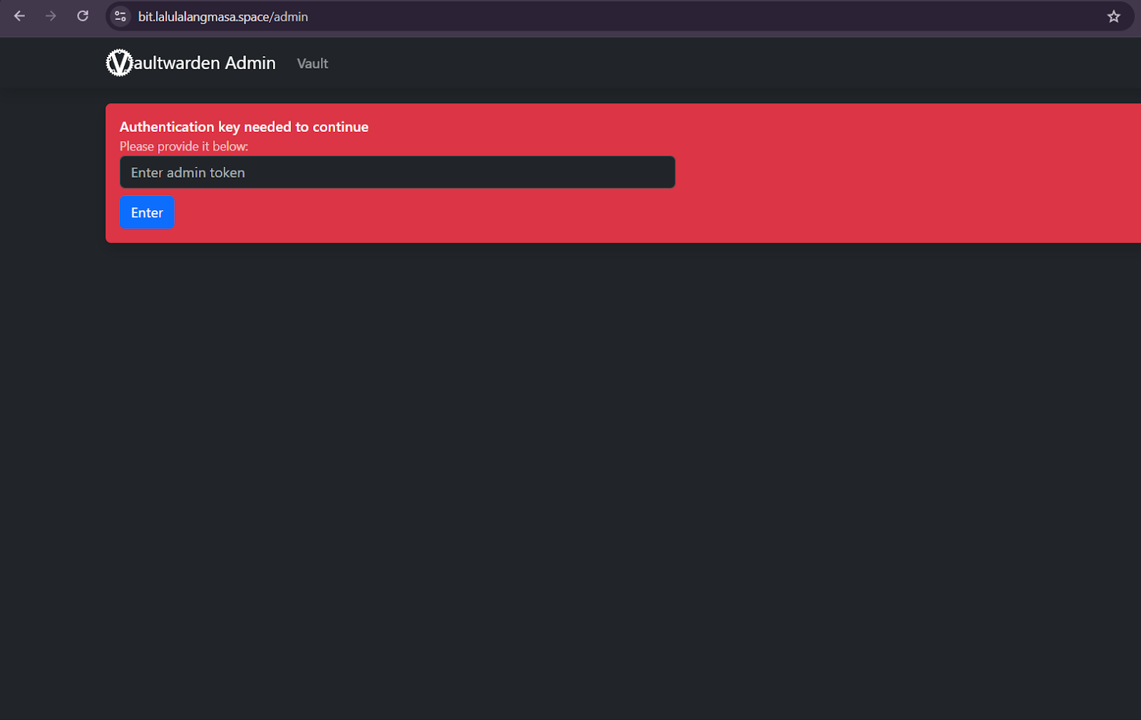 - Untuk masuk ke panel admin, Anda bisa akses ke namadomain.com/admin dan masukan admin token yang sebelumnya di setting pada file docker-compose.yml di Step 4.