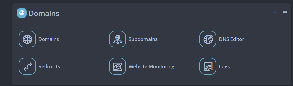 - Domains, digunakan untuk menambahkan, menghapus, dan mengelola domain utama maupun domain tambahan.