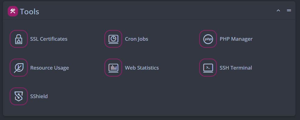 Fitur Tools pada SPanel digunakan untuk mengelola kebutuhan teknis website dan server, mulai dari keamanan, penjadwalan tugas, hingga monitoring resource. Menu yang tersedia pada fitur Tools di antaranya: