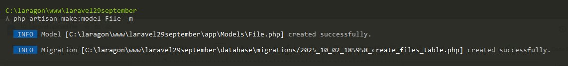 Selanjutnya, kita akan membuat tabel menggunakan fitur Migration Laravel. Langkahnya, kita buat tabel files melalui model untuk menyimpan nama/path file. Perintah artisan untuk membuat model adalah sebagai berikut.