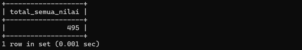 FROM nilai_mahasiswa;Query ini menjumlahkan seluruh nilai yang ada dalam tabel. Berikut hasilnya: