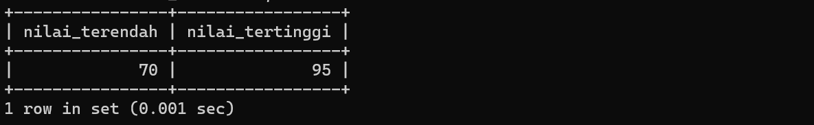 FROM nilai_mahasiswa;Berikut nilai terendah dan tertingginya: