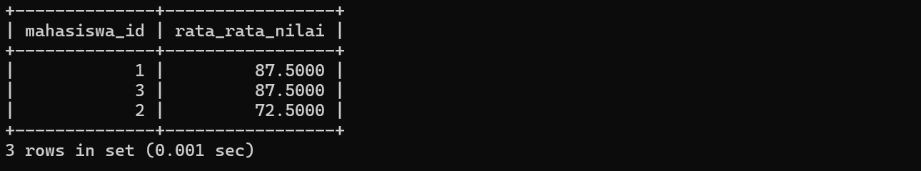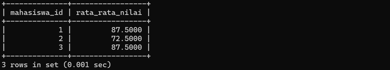 GROUP BY mahasiswa_id;Query berikut digunakan untuk menghitung rata-rata nilai setiap mahasiswa dengan mengelompokkan data berdasarkan mahasiswa_id menggunakan GROUP BY. Berikut hasilnya :