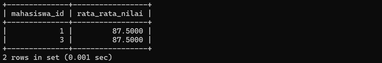 HAVING AVG(nilai) > 80;Query diatas digunakan untuk menampilkan mahasiswa yang rata-rata nilainya di atas 80. Berikut hasil dari query diatas: