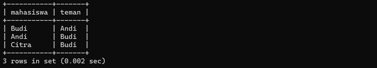 JOIN mahasiswa b ON a.id_teman = b.id;Hasil Query SELF JOIN