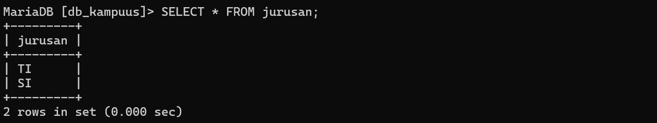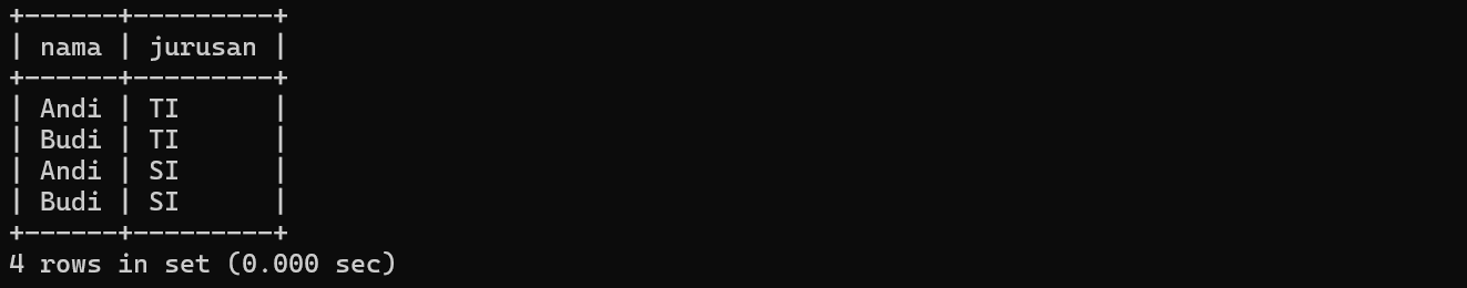 CROSS JOIN jurusan;Hasil Query CROSS JOIN