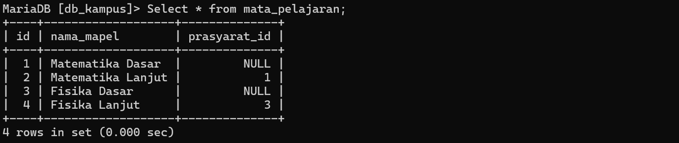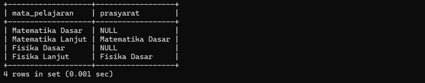 ON m.prasyarat_id = p.id;Hasil Query