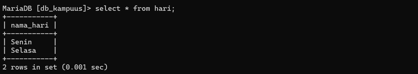 Studi Kasus CROSS JOIN (Jadwal Hari dan Mata Pelajaran)