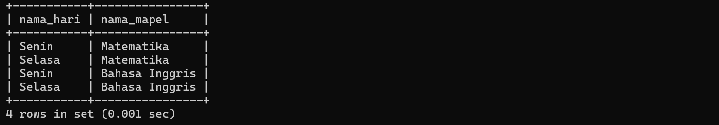 CROSS JOIN mata_pelajaran_jadwal;Hasil Query