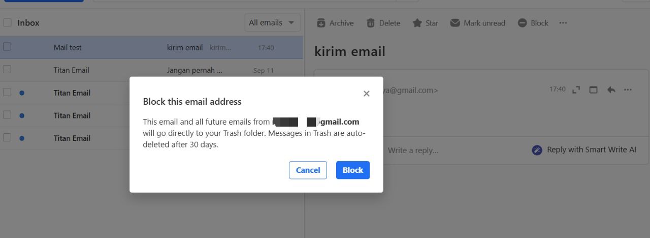 - Klik “Block” untuk mengonfirmasi. Email ini dan semua email dari pengirim tersebut di masa depan akan langsung masuk ke folder sampah (trash).