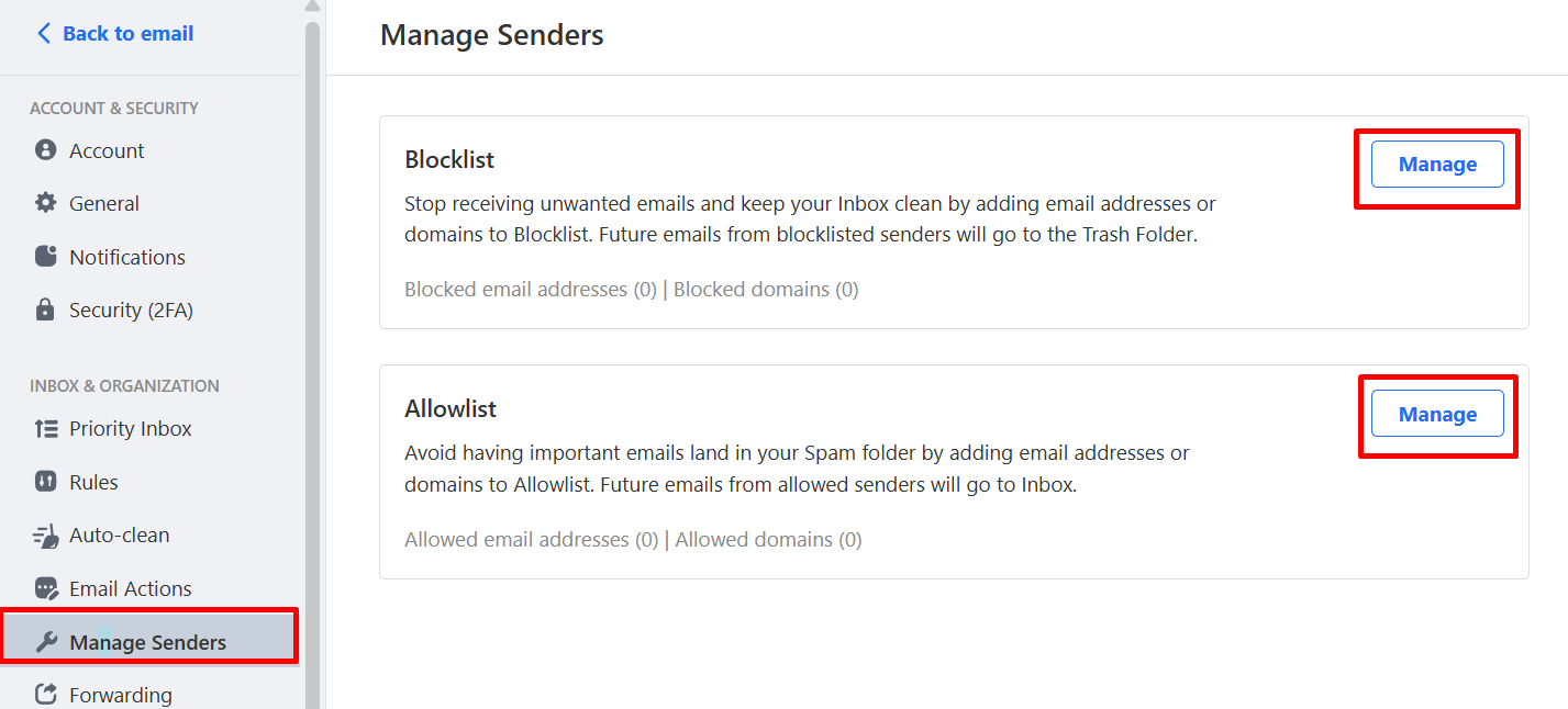 - Pada panel navigasi di sisi kiri, klik “Manage Senders”. Di bagian “Blocklist”, klik “Manage”.