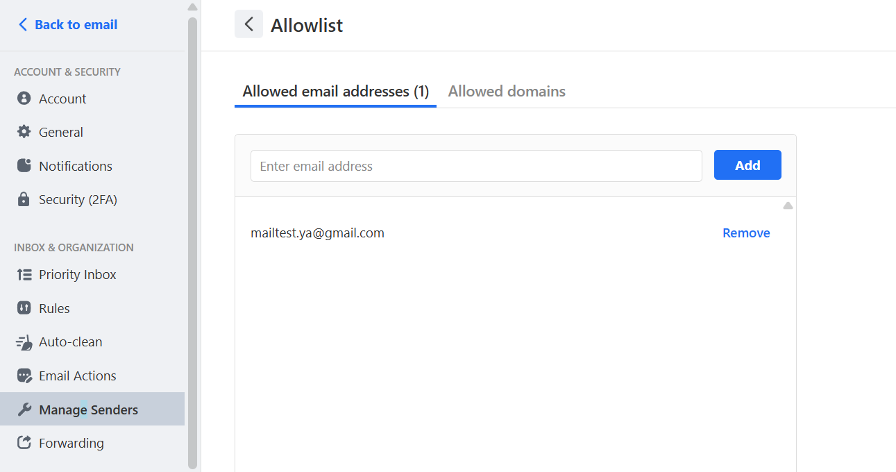 - Anda bisa menambahkan alamat email atau nama domain yang ingin Anda masukkan ke daftar whitelist, lalu klik “Add”.
