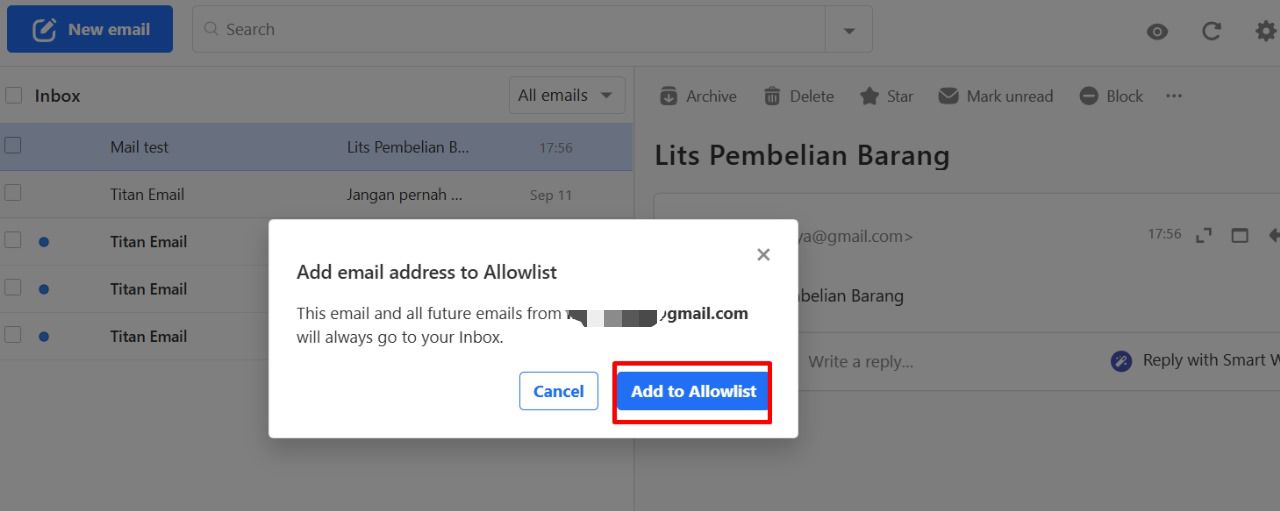 - Pilih “Add to Allowlist” dari menu yang muncul. Kemudian, Sebuah jendela konfirmasi akan muncul. Anda bisa memilih untuk melakukan whitelist hanya pada alamat email tersebut atau seluruh domain pengirim.