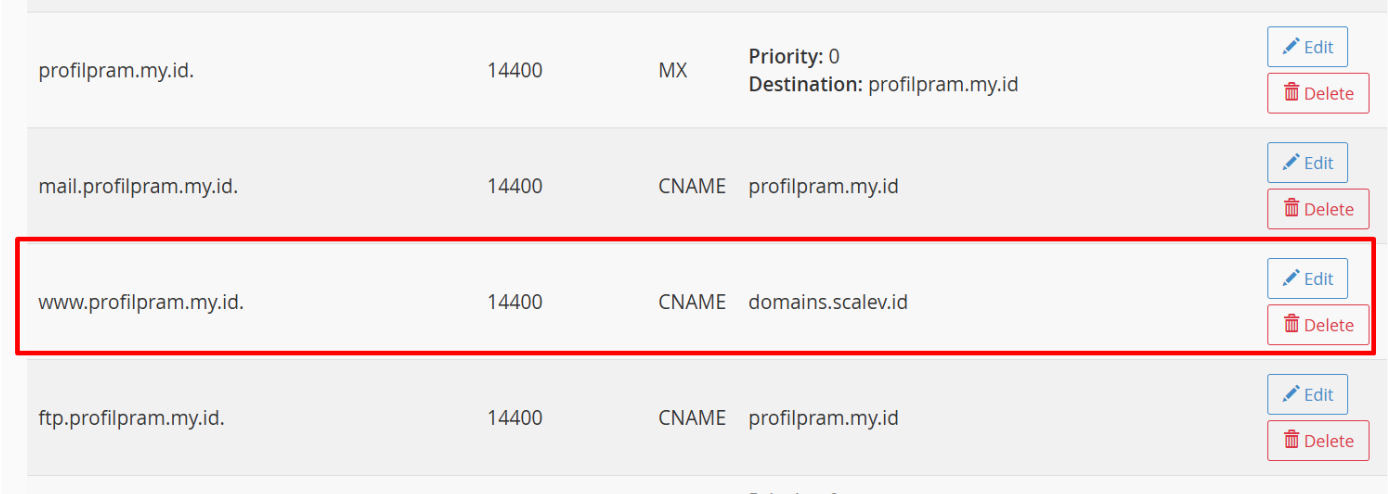 - Ubah cName subdomain www untuk diarahkan ke cName record yang Anda dapatkan di Scalev seperti pada contoh berikut
