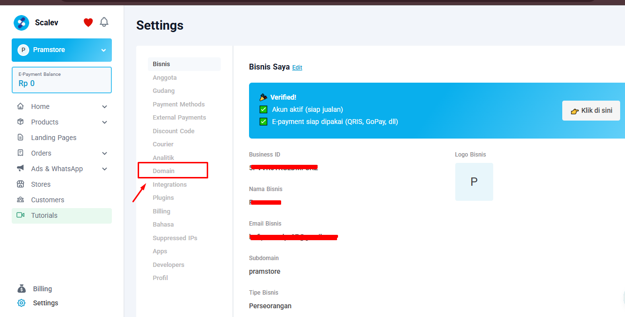 - Setelah Setting DNS Tunggu waktu propagasi DNS dengan estimasi 1×24 jam. Kemudian, kembali ke halaman Scalev, lalu Klik “verifikasi”. Jika berhasil, status domain Anda akan aktif seperti berikut.