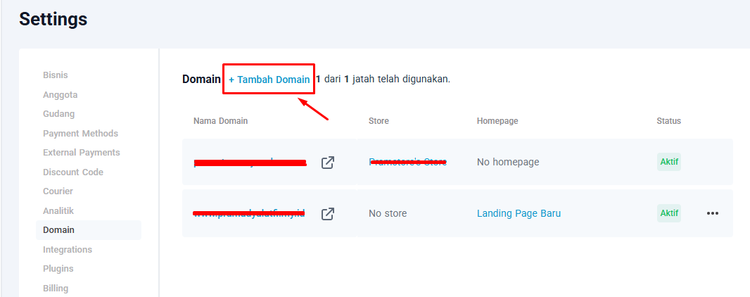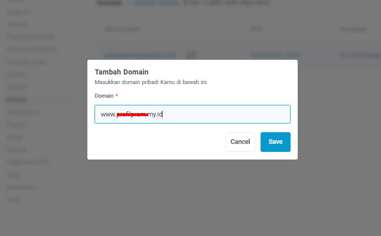 - Setelah masuk ke halaman setting, Klik menu domain.
