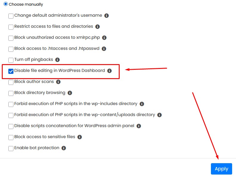 Pilih opsi “Choose Manually” lalu centang pada bagian Disable file editing in WordPress Dashboard lalu klik button Apply.
