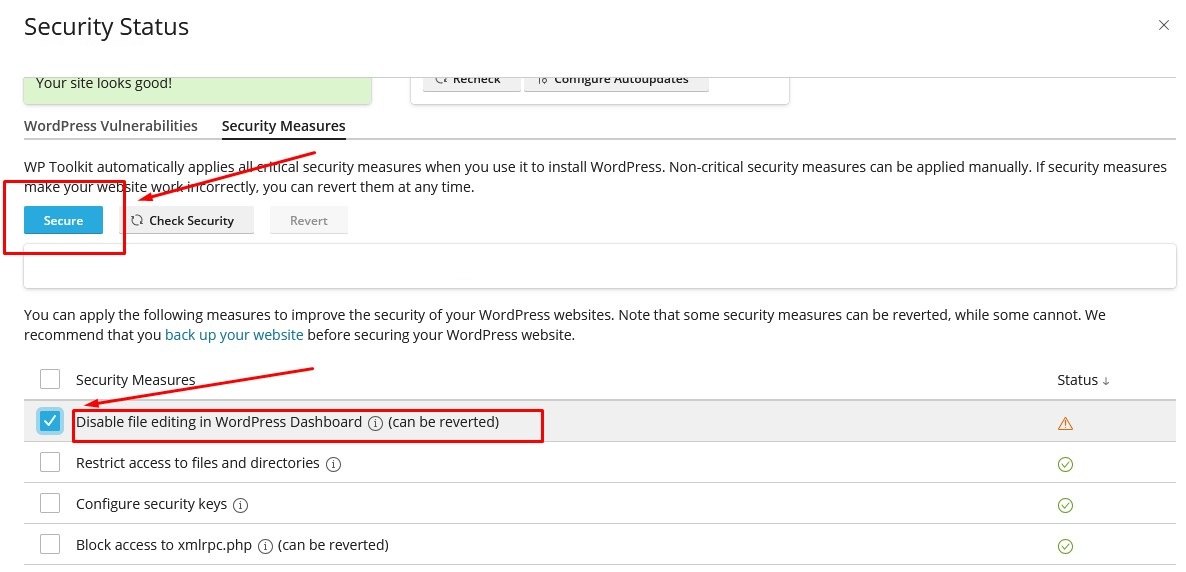 Pilih pada bagian Security measures, kemudian centang pada opsi “Disable file editing in WordPress Dashboard (can be reverted)” lalu klik menu button Secure.