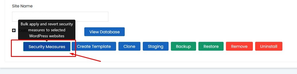 Klik menu WordPress Management, lalu pilih Security Measures. Jika ada konfigurasi yang belum aman, tombol tersebut akan muncul sebagai Apply Critical Security Measures, seperti pada gambar berikut.