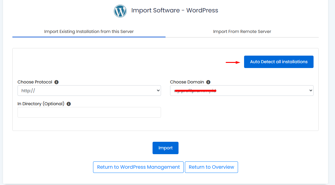 Opsi Import Existing Installation from This Server dapat Anda gunakan jika website WordPress sudah terpasang di server yang sama. Berikut langkah-langkahnya