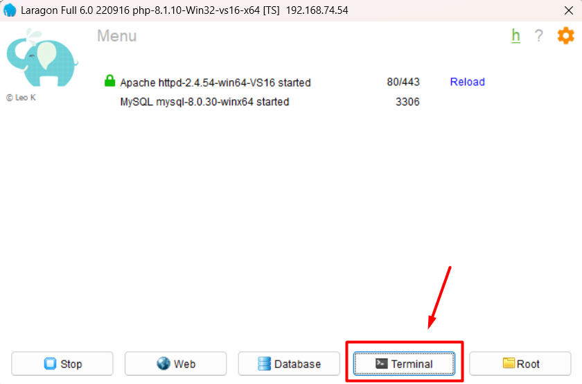 - Buka aplikasi Laragon di komputer, kemudian buka tombol “Terminal”.