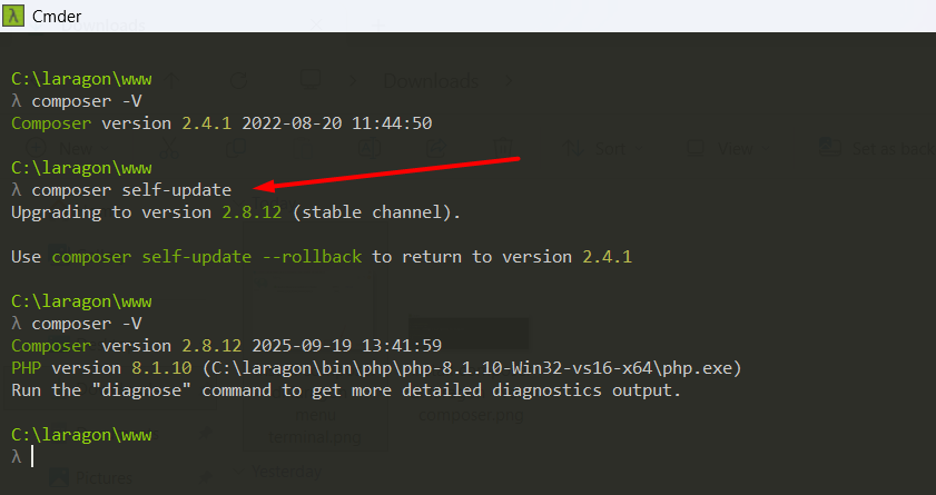 Untuk melakukan update Composer di Laragon, jalankan perintah berikut ini pada terminal Laragon: