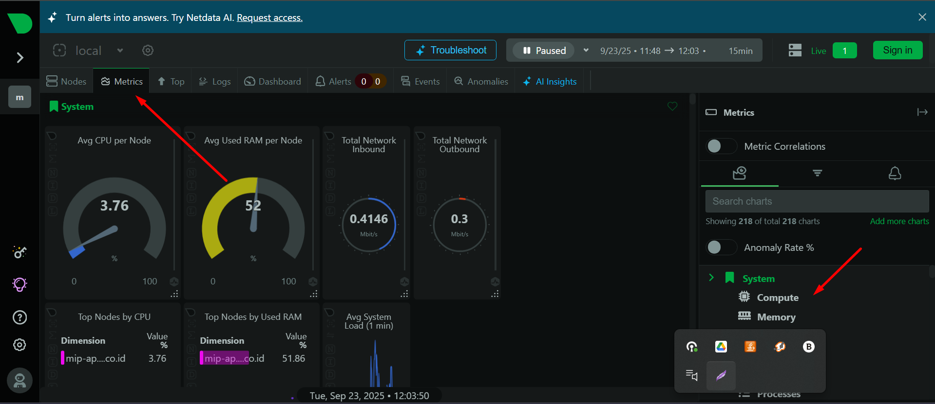Setelah masuk ke dahboard netdata, Anda bisa pilih “Metrix” pada kiri atas, dan disebelah kanan ada pilihan banyak “metrix collection”.
