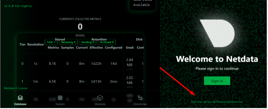 Setelah konfigurasi selesai, silakan akses melalui browser dan ketikkan alamat http://ipvpsanda:19999 dan klik “Skip and use the dashboard anonymously”.