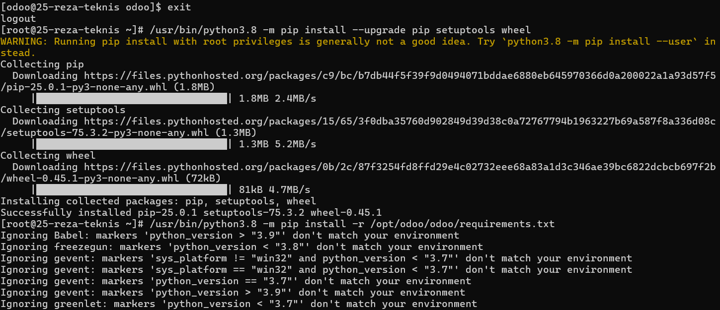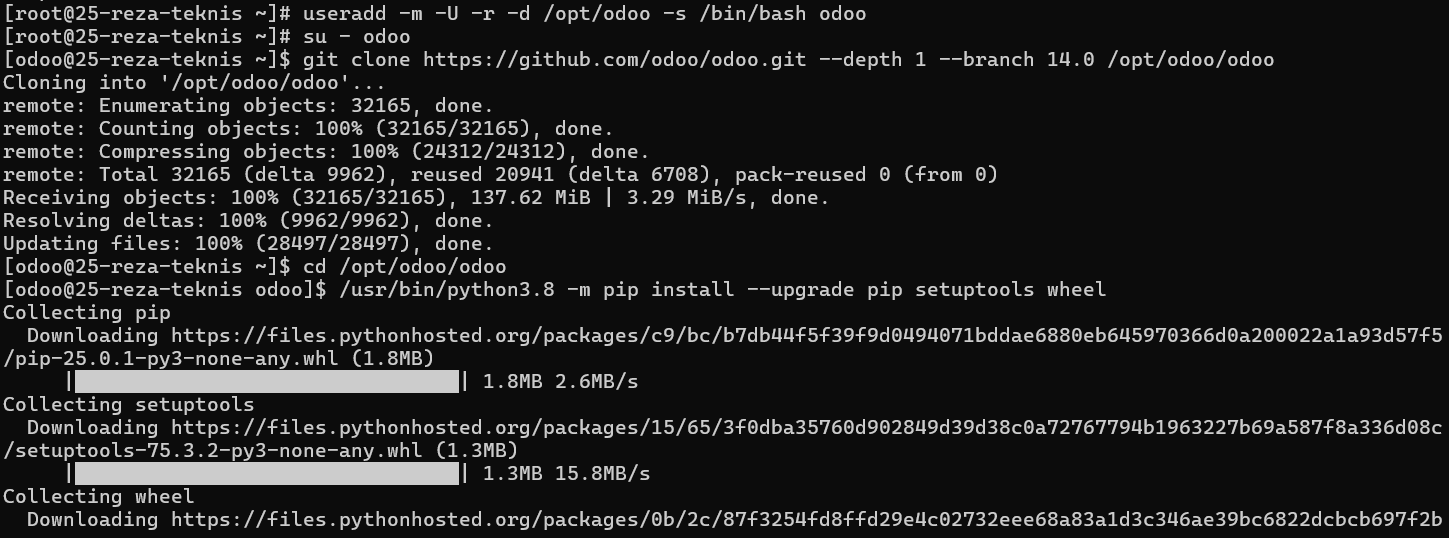- Install Python Library Odoo. Masih sebagai user odoo, jalankan beberapa perintah berikut: