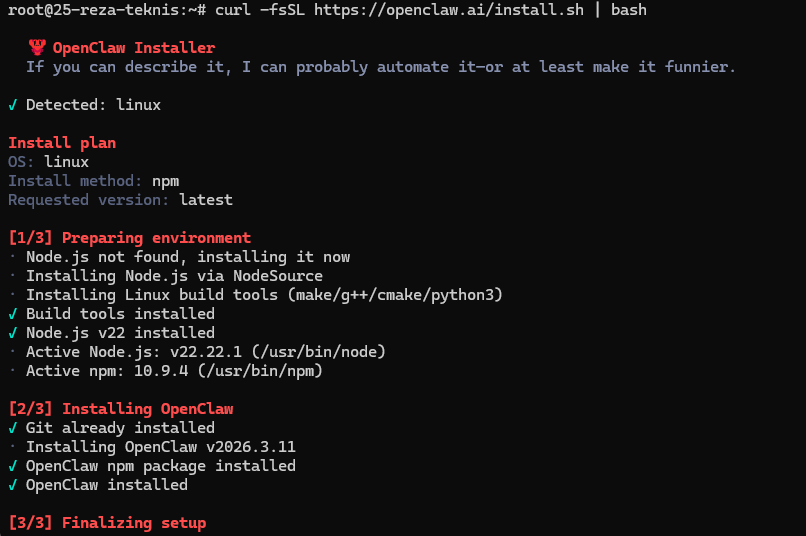 - Untuk install OpenClaw, cukup menjalankan satu perintah berikut, kemudian installer akan berjalan dan kita dapat langsung melakukan konfigurasi di dalamnya.