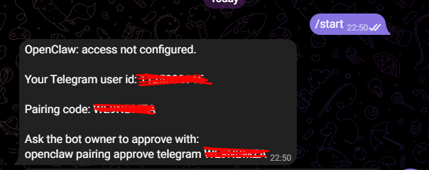 - Kembali ke Telegram, mulai chat dengan bot telegram yang sudah kita buat sebelumnya. Akan muncul pairing code yang diperlukan.