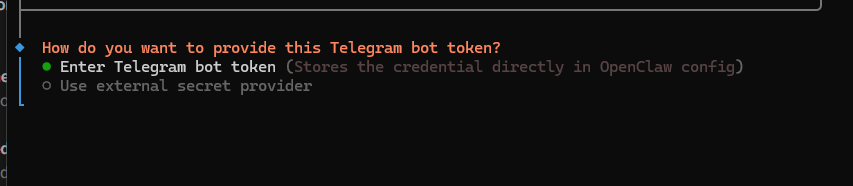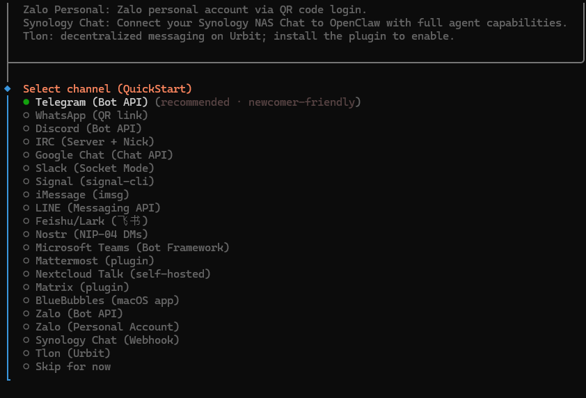 Untuk menghubungkan OpenClaw dengan Telegram, Anda perlu membuat bot terlebih dahulu melalui akun resmi BotFather di Telegram. Setelah membuat bot, Anda akan mendapatkan bot token. Masukkan bot token tersebut ke konfigurasi yang sedang dilakukan.