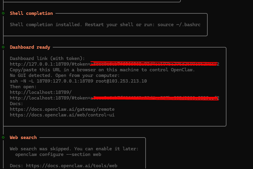 - Setelah melengkapi semua konfigurasi, tunggu prosesnya hingga selesai dan muncul URL ke dashboard web OpenClaw.