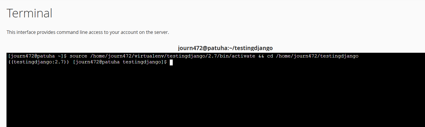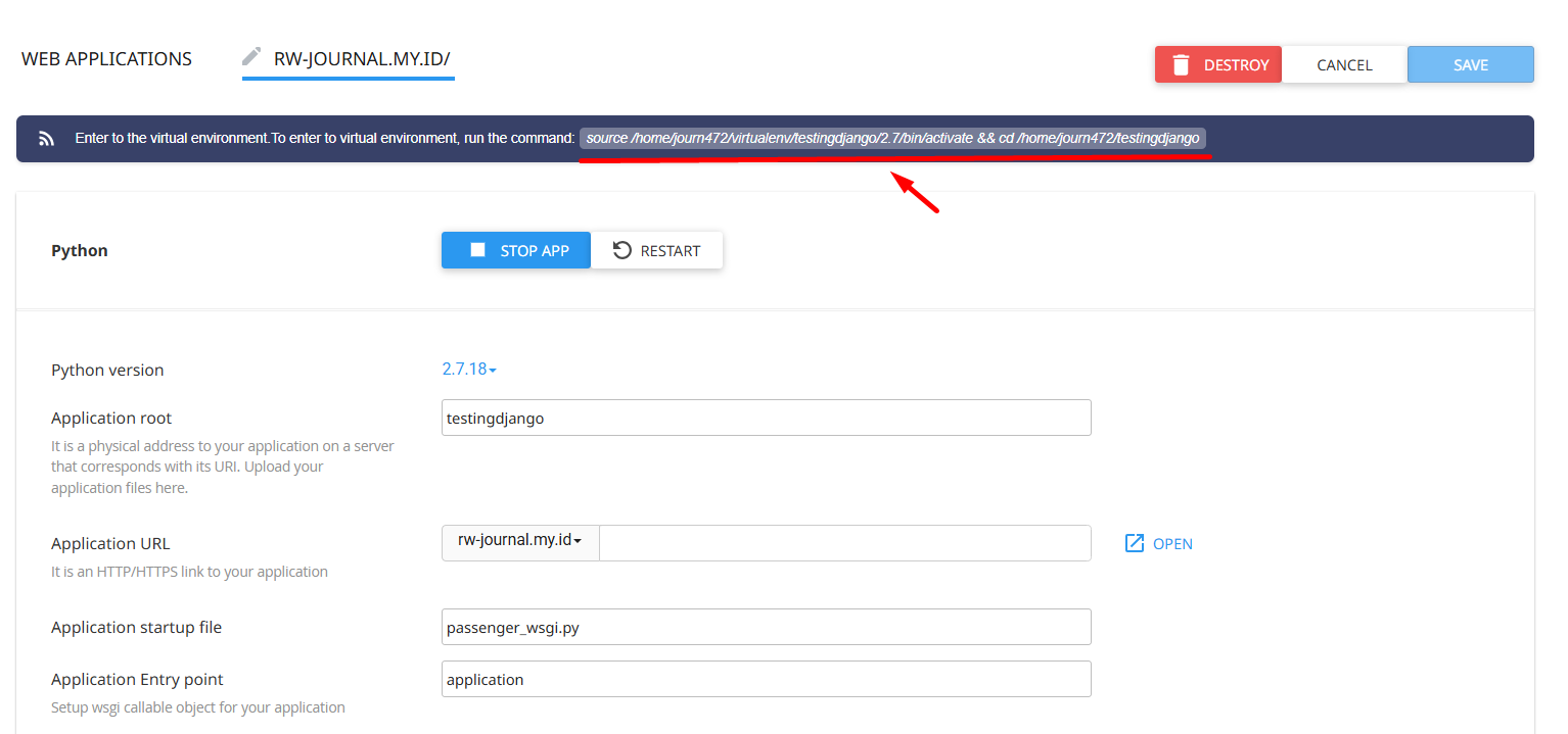 Langkah selanjutnya, silakan akses virtual environment melalui SSH atau Terminal di cPanel. Akses virtual environment digunakan untuk menjalankan perintah Python secara terisolasi, seperti menginstal dependency, menjalankan aplikasi, serta memastikan setiap library yang digunakan tidak saling bertabrakan dengan konfigurasi sistem lainnya.