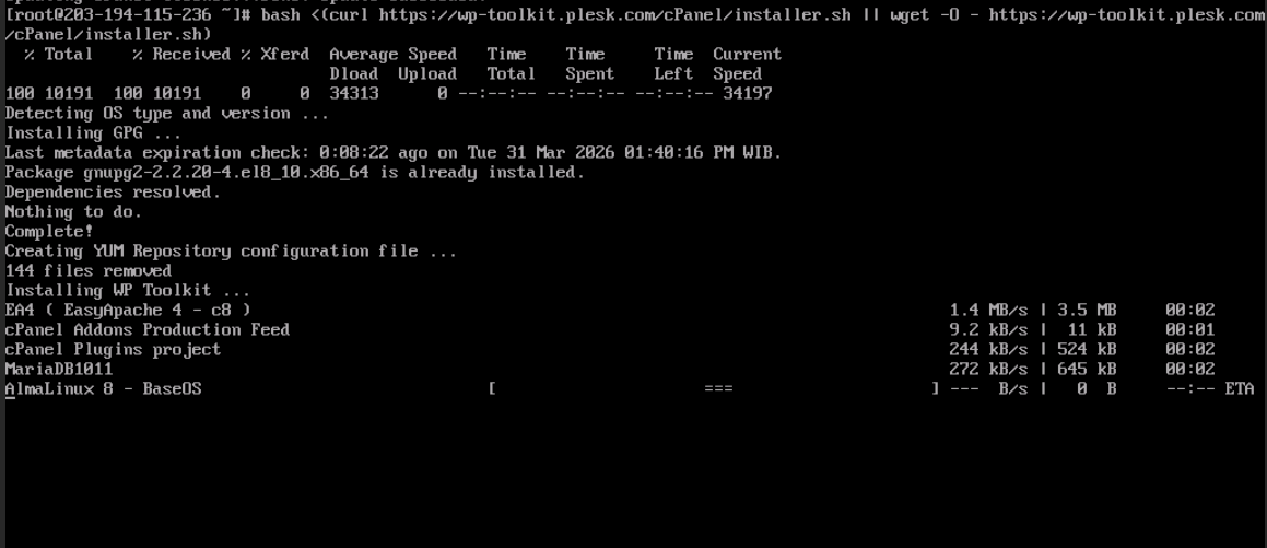 Sistem akan melakukan pengecekan dependensi dan menginstal paket secara otomatis. Jika muncul pesan sukses, berarti WP Toolkit sudah siap digunakan.