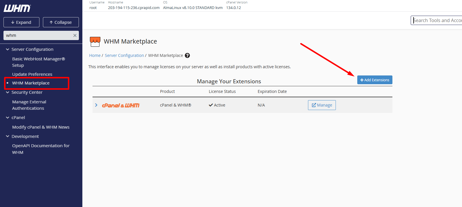 - Pada kolom pencarian di sisi kiri, ketikan “WHM Marketplace”. Setelah itu klik tombol Add Extensions.