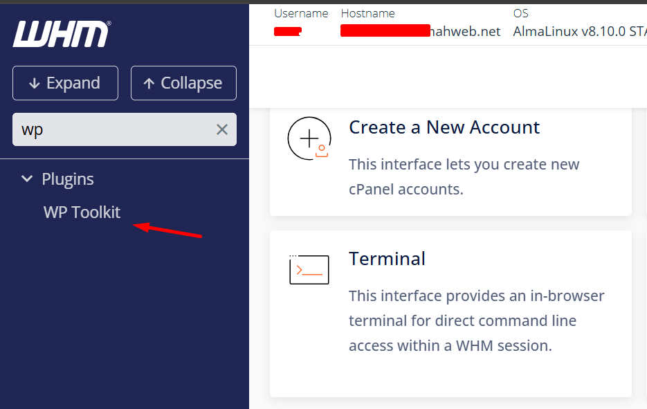 - Setelah selesai, menu WP Toolkit akan muncul di bilah navigasi samping WHM dan juga di akun cPanel pengguna.