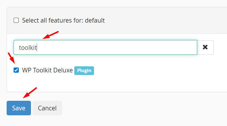 - ketikkan ‘toolkit’ pada kolom pencarian, lalu centang opsi “WP Toolkit Deluxe Plugin”. Klik tombol save untuk menyimpan.