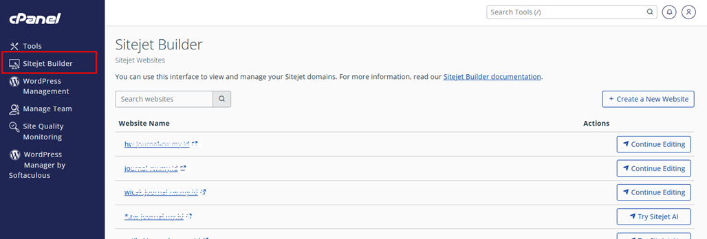- Setelah itu, pilih Sitejet Builder di sidebar sebelah kiri.