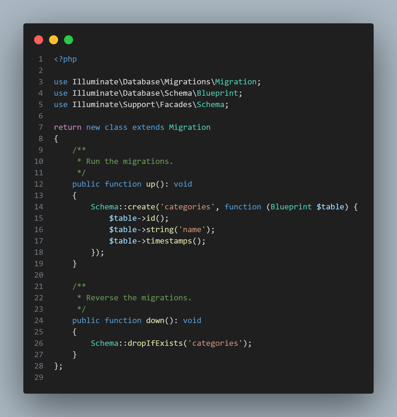 php artisan make:migration create_categories_tableKemudian kita isikan data yang akan digunakan seperti berikut: