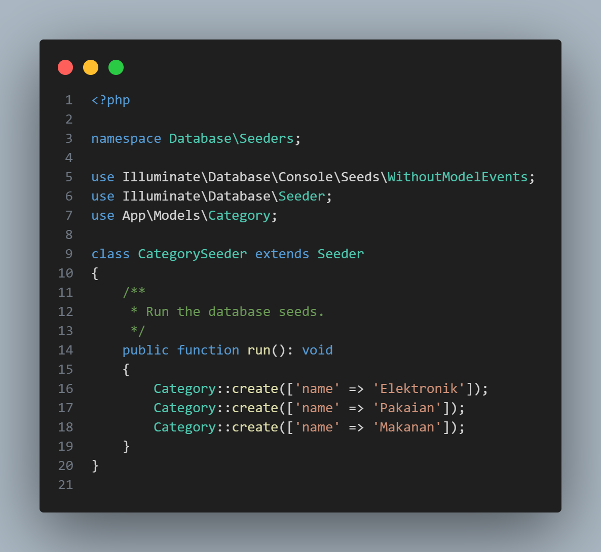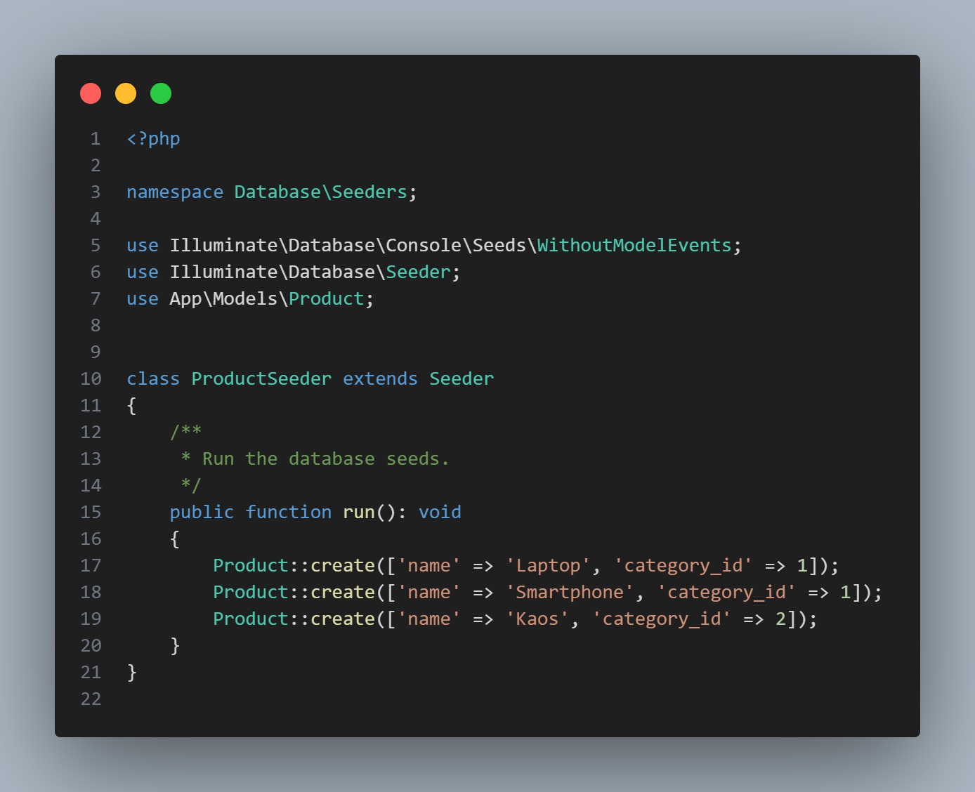 php artisan make:seeder ProductSeeder.Isi file seeder database/seeders/CategorySeeder.php berikut: