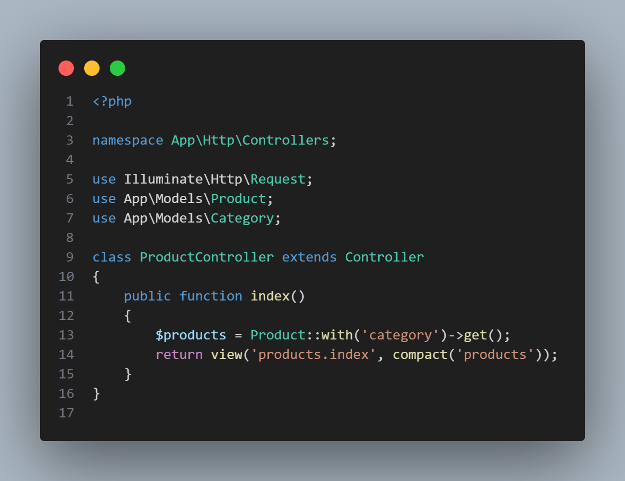 php artisan make:controller ProductControllerLangkah selanjutnya, kita akan membuat function view untuk menampilkan relasi data antara data category dan product yang akan kita buat. Berikut adalah contohnya: