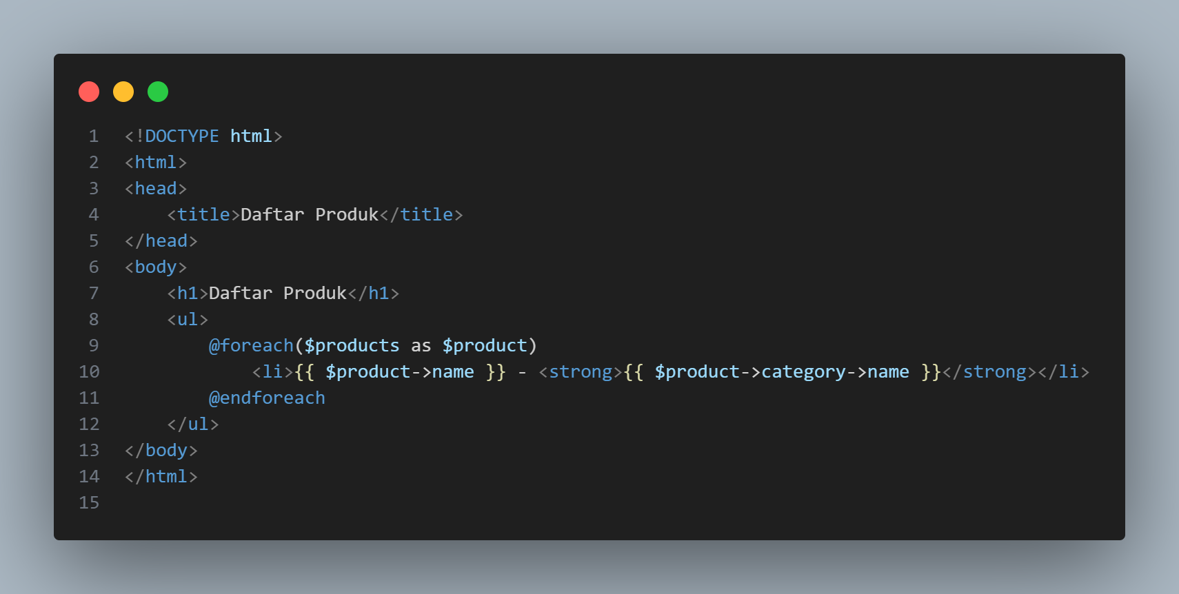 Pada step ini, kita akan membuat tampilan view relasi data category dan product yang akan menampilkan data relasi pada folder resources/views/products/index.blade.php. Berikut contoh skrip yang bisa digunakan: