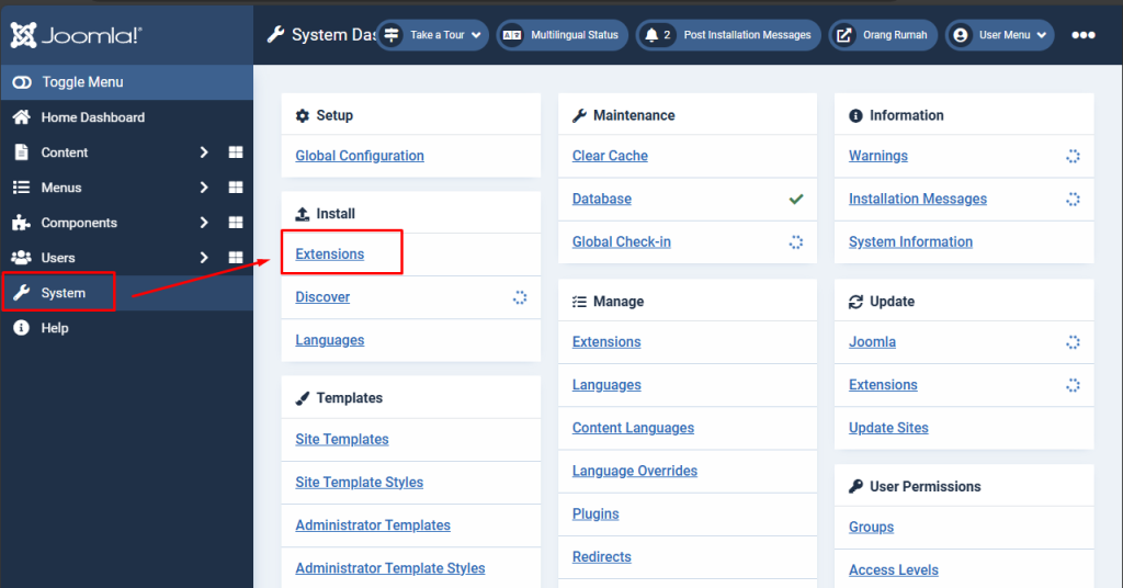 namadomainanda.com/administrator. - Klik menu System > Install, lalu pilih Extensions.