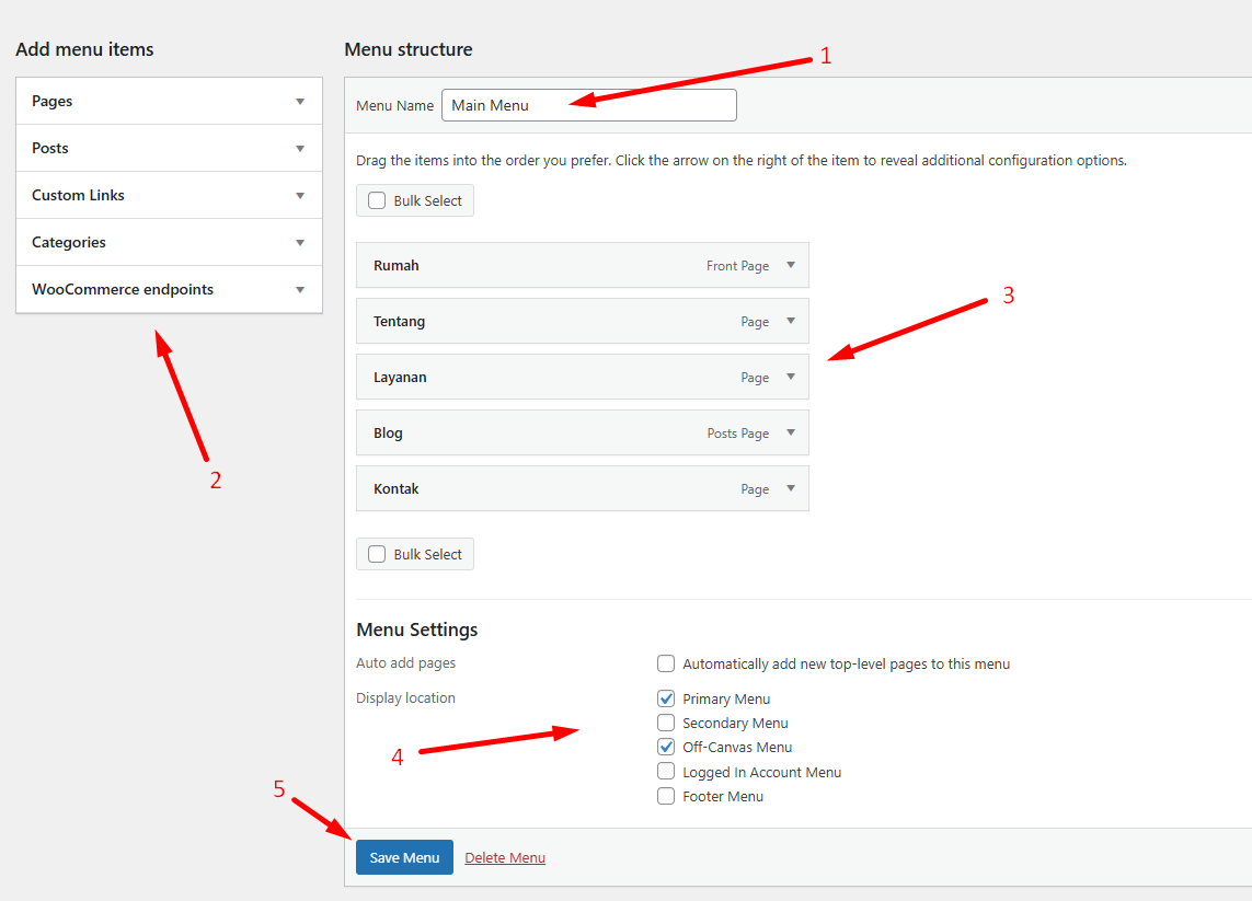 - Menu Settings: Di bagian ini, Anda bisa memilih agar menu ditampilkan dimana saja. Apakah hanya ditampilkan di menu utama, atau secondary menu, atau footer. Pilihlah sesuai kebutuhan toko online.