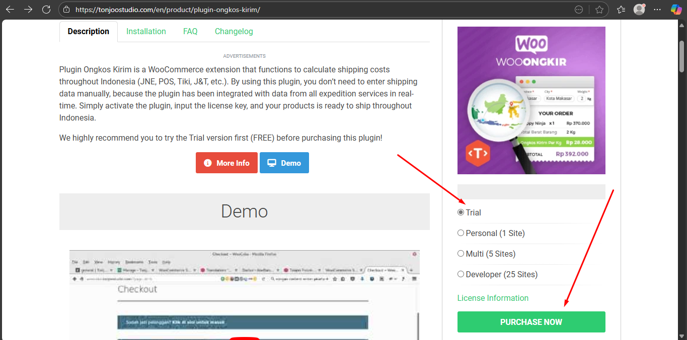 Pada tutorial kali ini, kami akan menggunakan plugin ongkir dari Tonjoo Studio yang bisa didapatkan di sini. Plugin ini memerlukan lisensi untuk penggunaan penuhnya, namun juga tersedia versi trial yang dapat kita gunakan selama 7 hari.