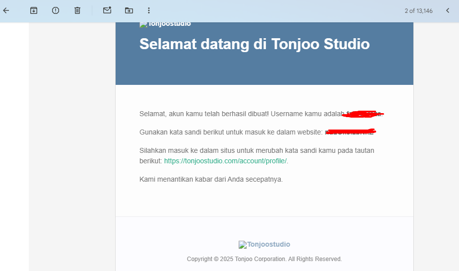 - Setelah itu, akan menerima email notifikasi aktivasi akun yang dapat digunakan untuk login ke Tonjoo Studio,